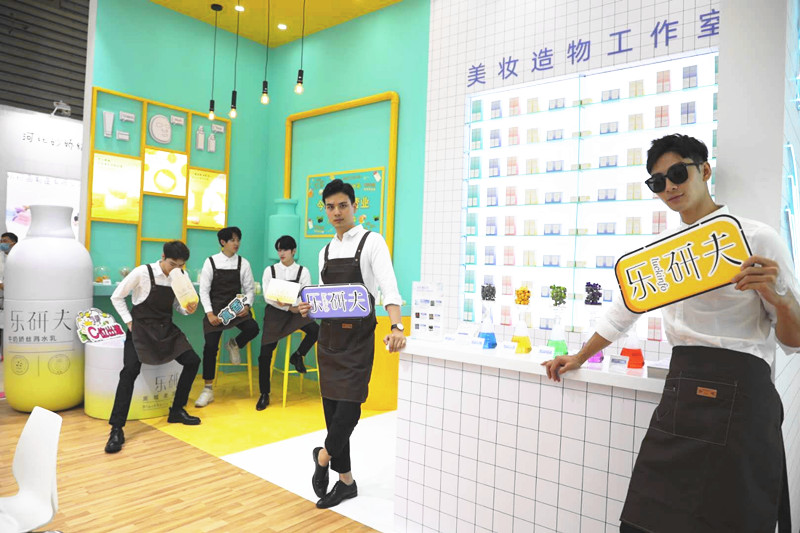 展位现场最热闹最吸引人的区域,当属绵俪全新自有品牌——乐研夫展区。乐研夫是绵俪于2019年为顺应市场的发展,推出的全新自主国货品牌,主打“美妆造物工作室”的理念。