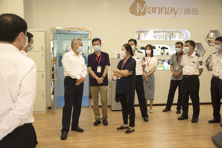 8月11日,广东省副省长陈良贤一行赴深圳开展疫情防控和食品化妆品安全调研工作,当日下午四时许,一行人走访了深圳绵俪日用化工有限公司,绵俪创始人张艳芳女士,副总经理张玉明先生陪同调研,并向省政府调研组一行详细介绍了绵俪和深圳市化妆品行业的发展情况。