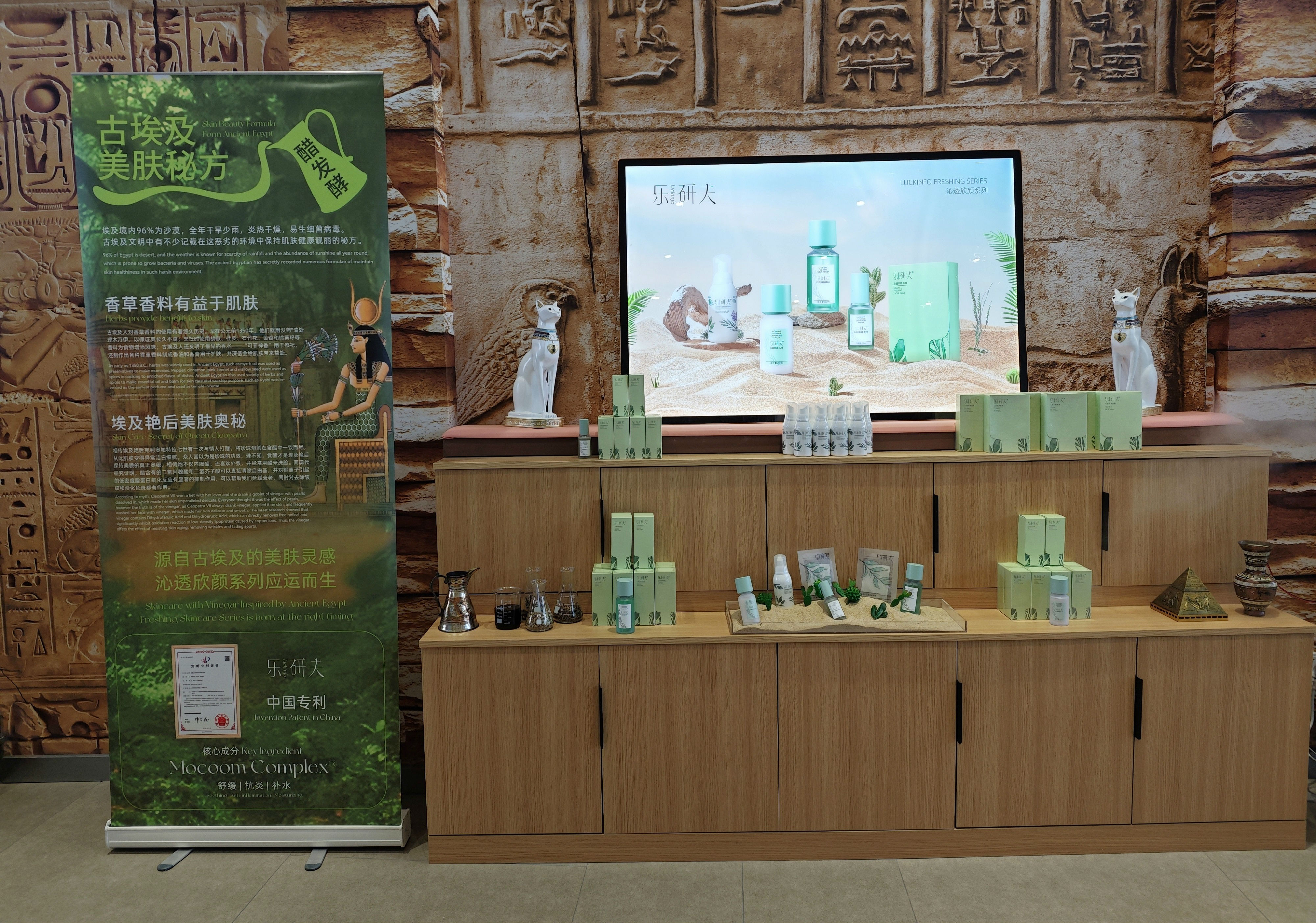 本次闪耀埃及馆的,是绵俪旗下自有品牌乐研夫重磅产品——沁透欣颜系列。该系列蕴含的核心成分Mocoom Complex®采用醋发酵技术,其灵感来源于古埃及艳后的食醋养肤。