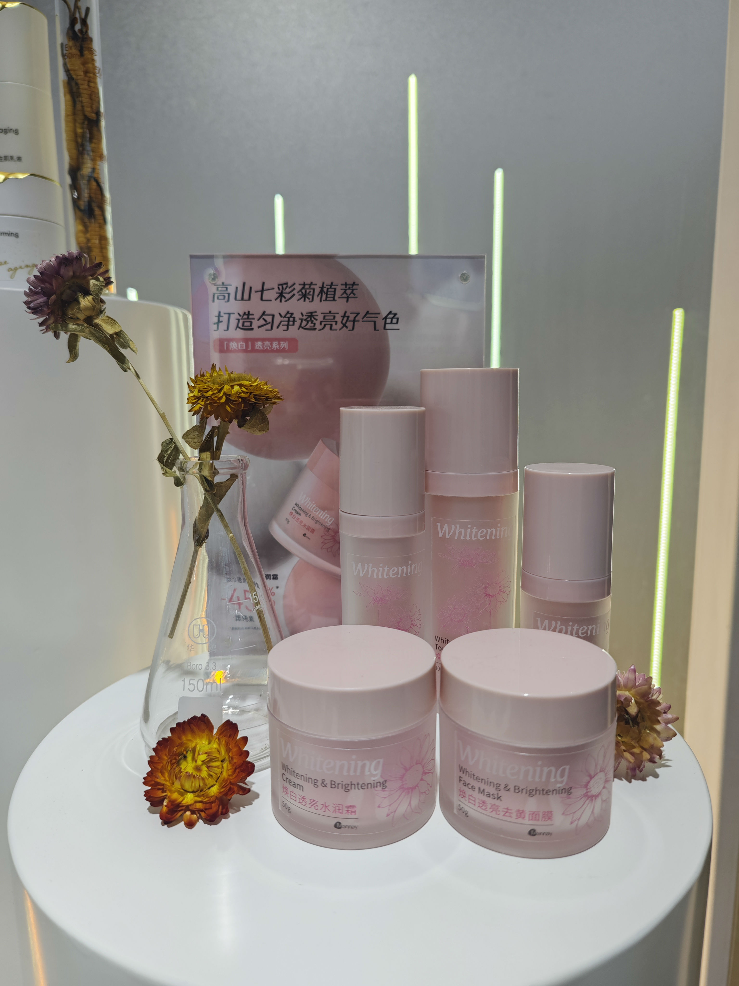 焕白透亮系列,臻选高山七彩菊,专利两段柔析提取技术萃取,不破坏原料活性的同时释放七彩菊美白功效,打造匀净透亮好气色。