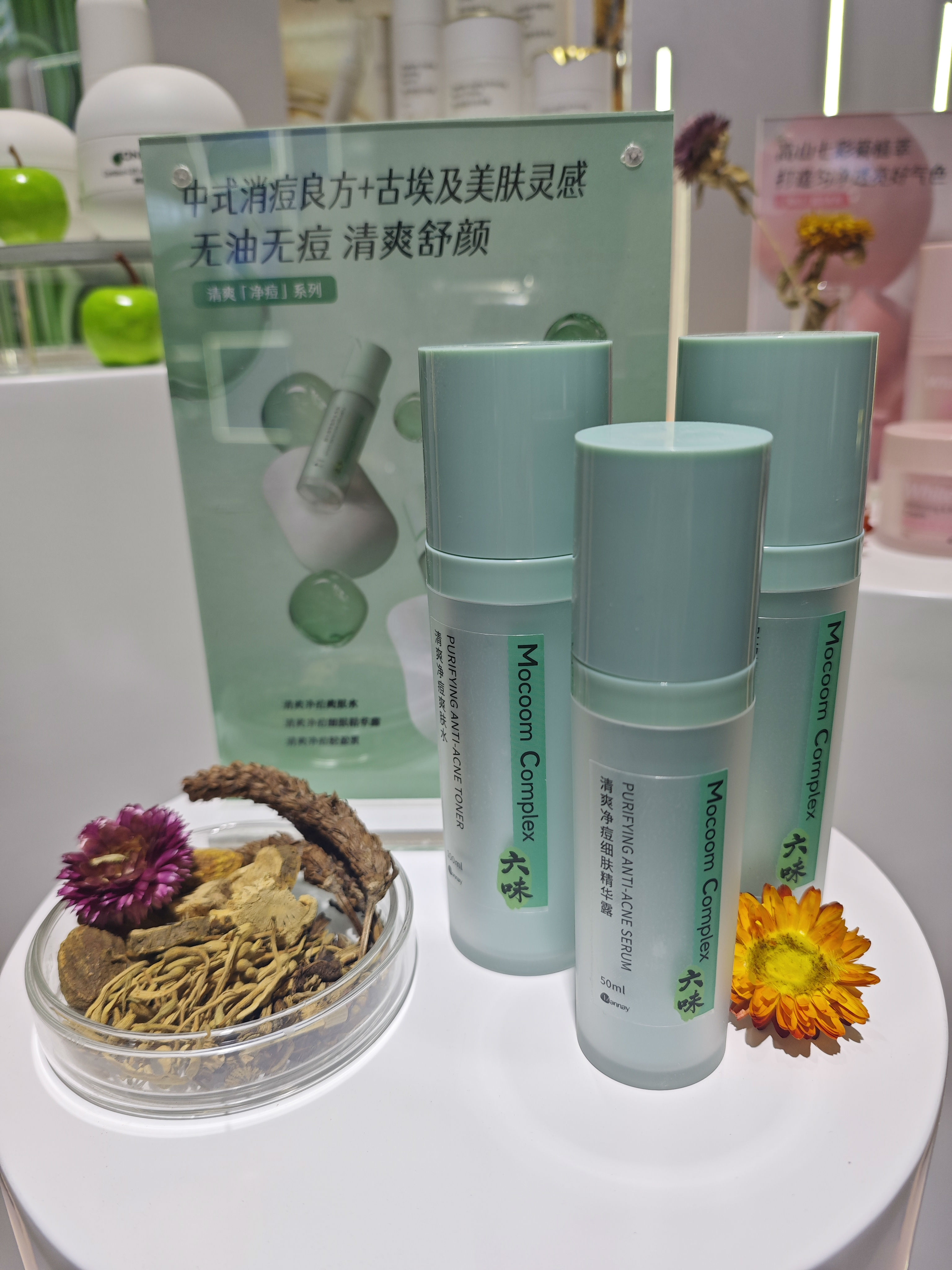 清爽净痘系列,采用了中西合璧的祛痘思路,中式消痘良方六味抗痘散和古埃及美肤灵感MOCOOM Complex ®蜜麻兰促颜素两大专利祛痘成分相辅相成,有效舒缓净痘。