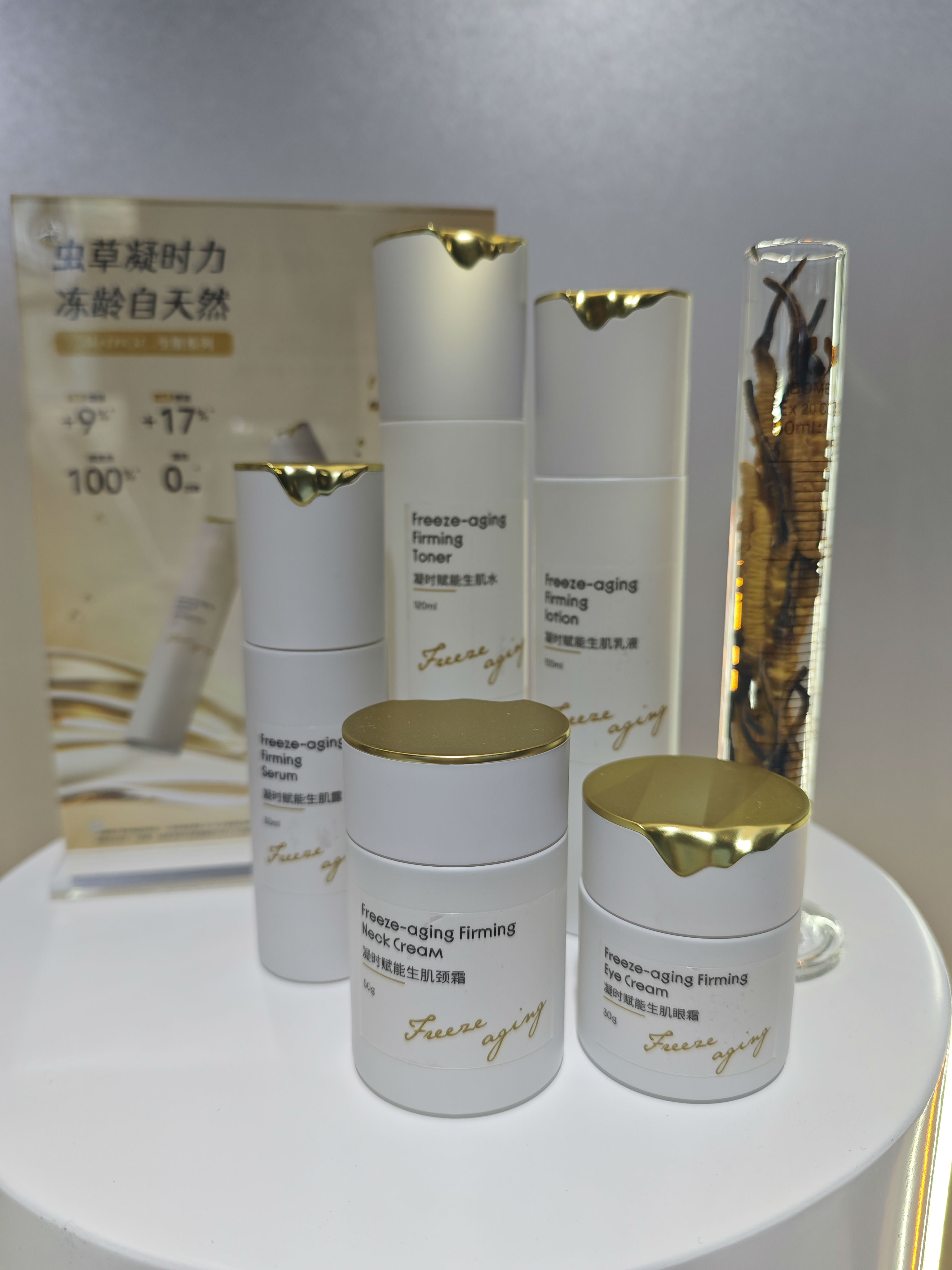 凝时赋能系列,臻选珍贵西藏那曲虫草,专利温浸摄取技术萃取其精华,增弹紧塑肌肤,打造冻龄肌。